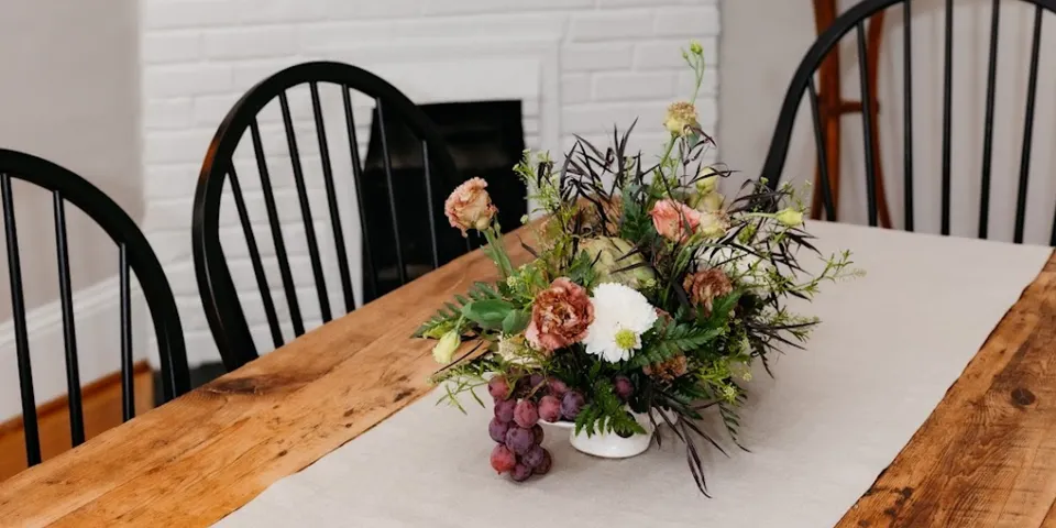 A romantic arrangement by Good Southern Blooms features fresh grapes and artichokes.